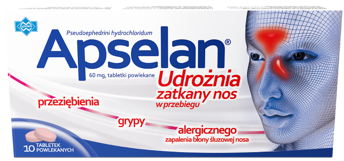 Apselan to lek zawierający pseudoefedrynę chlorowodorek, który łagodzi objawy przekrwienia błon śluzowych górnych dróg oddechowych. Stosowany jest w przypadku kataru, zatkanego nosa oraz zapalenia zatok przynosowych, towarzyszących przeziębieniu, grypie czy alergiom. Działa poprzez zmniejszenie obrzęku błon śluzowych, ułatwiając oddychanie i poprawiając komfort w trakcie choroby. Lek jest przeznaczony dla dorosłych oraz dzieci powyżej 12. roku życia. Przed zastosowaniem zaleca się konsultację z lekarzem w przypadku występowania chorób przewlekłych.