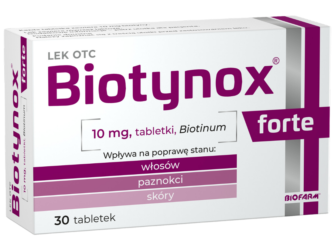Biotynox Forte to lek witaminowy zawierający biotynę, witaminę z grupy B rozpuszczalną w wodzie. Preparat wspomaga leczenie niedoboru biotyny objawiającego się wypadaniem włosów, zaburzeniami wzrostu włosów i paznokci oraz stanami zapalnymi skóry w okolicach oczu, nosa, ust, uszu i krocza. Biotyna obecna w leku uczestniczy w procesach powstawania keratyny oraz różnicowania komórek naskórka, włosów i paznokci, co przyczynia się do poprawy ich kondycji. Lek stosuje się po wykluczeniu innych przyczyn wymienionych objawów przez lekarza.