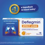 Deflegmin Effect Long to lek mukolityczny w formie kapsułek o przedłużonym uwalnianiu, zawierający ambroksolu chlorowodorek jako substancję czynną. Stosowany jest w leczeniu ostrych i przewlekłych chorób płuc oraz oskrzeli, które przebiegają z utrudnionym odkrztuszaniem lepkiej wydzieliny. Lek działa poprzez zwiększenie produkcji śluzu, zmniejszenie jego lepkości oraz poprawę funkcji rzęsek nabłonka oddechowego, co ułatwia odkrztuszanie i łagodzi kaszel mokry. Ambroksol może również zwiększać skuteczność niektórych antybiotyków w płucach. Produkt zawiera dodatkowo składniki pomocnicze, w tym sacharozę i barwnik indygotynę, które mogą wywoływać reakcje alergiczne. Preparat przeznaczony jest dla dorosłych i charakteryzuje się wygodną, jednodniową dawką.