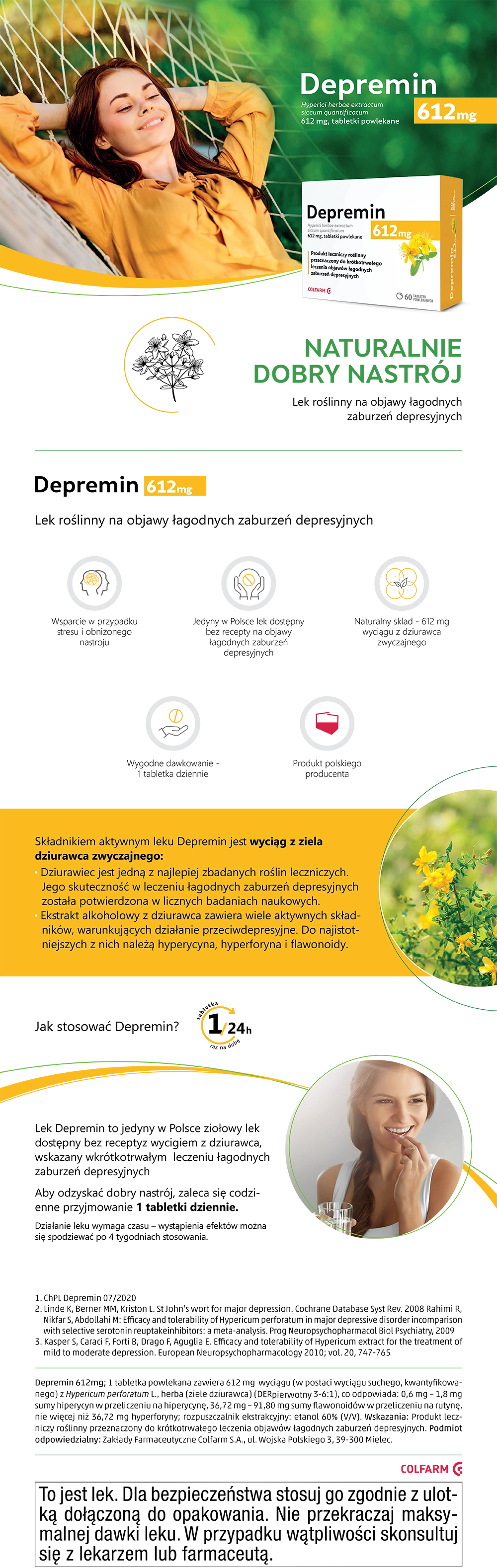 Depremin należy przyjmować doustnie, po 1 tabletce dziennie. Nie należy przekraczać maksymalnej dawki leku, co jest kluczowe dla bezpieczeństwa stosowania.