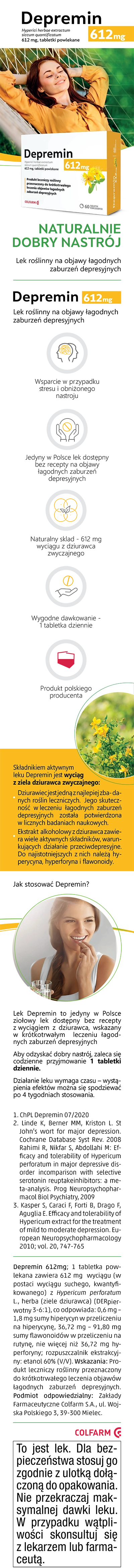 Depremin to lek roślinny zawierający wyciąg z ziela dziurawca, stosowany w krótkotrwałym leczeniu łagodnych zaburzeń depresyjnych oraz problemów z nastrojem. Substancje czynne zawarte w dziurawcu wpływają na neuroprzekaźniki w mózgu, takie jak serotonina i dopamina, co pomaga poprawić samopoczucie oraz łagodzić objawy niepokoju i stresu. Dodatkowo preparat posiada właściwości przeciwzapalne, przeciwbólowe, antybakteryjne i przeciwgrzybicze. Lek jest dostępny w formie tabletek powlekanych i przeznaczony dla dorosłych.