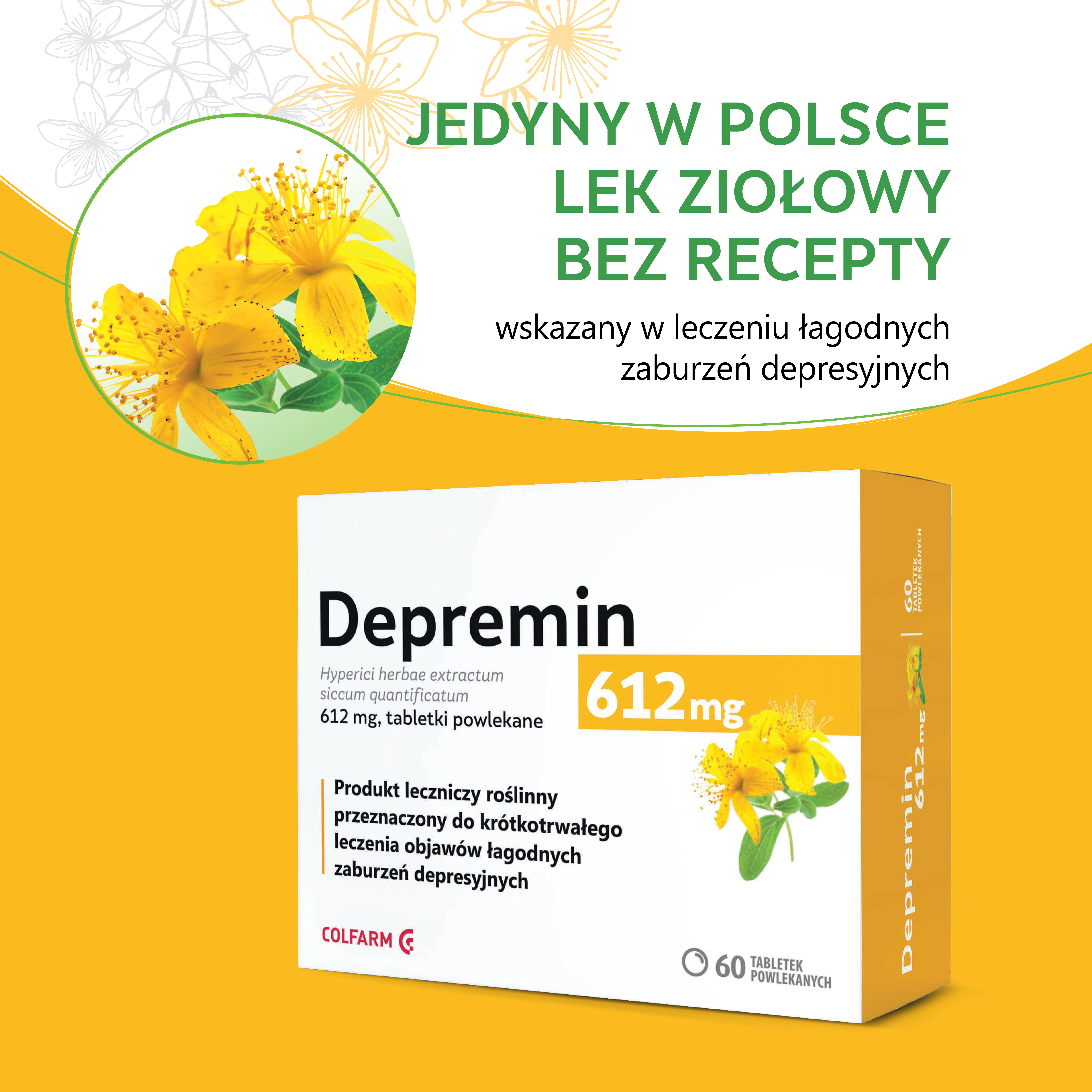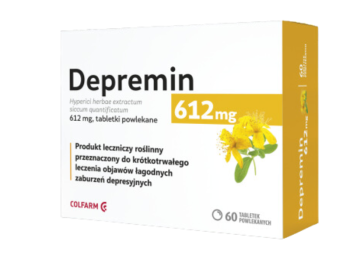 Depremin to lek roślinny zawierający wyciąg z ziela dziurawca, stosowany w krótkotrwałym leczeniu łagodnych zaburzeń depresyjnych oraz problemów z nastrojem. Substancje czynne zawarte w dziurawcu wpływają na neuroprzekaźniki w mózgu, takie jak serotonina i dopamina, co pomaga poprawić samopoczucie oraz łagodzić objawy niepokoju i stresu. Dodatkowo preparat posiada właściwości przeciwzapalne, przeciwbólowe, antybakteryjne i przeciwgrzybicze. Lek jest dostępny w formie tabletek powlekanych i przeznaczony dla dorosłych.