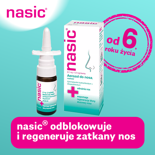 Nasic to lek w formie aerozolu do nosa, który łączy działanie ksylometazoliny i deksopantenolu. Ksylometazolina obkurcza naczynia krwionośne, zmniejszając obrzęk i przekrwienie błony śluzowej nosa, co ułatwia oddychanie przy zatkanym nosie, np. podczas przeziębienia. Deksopantenol wspomaga regenerację i gojenie błony śluzowej nosa, chroniąc ją przed podrażnieniami. Lek stosuje się także po operacjach nosa, by przyspieszyć proces gojenia i poprawić drożność nosa. Nasic jest przeznaczony dla osób powyżej 6. roku życia i nie powinien być stosowany dłużej niż 7 dni. Zawiera chlorek benzalkoniowy jako środek konserwujący.
