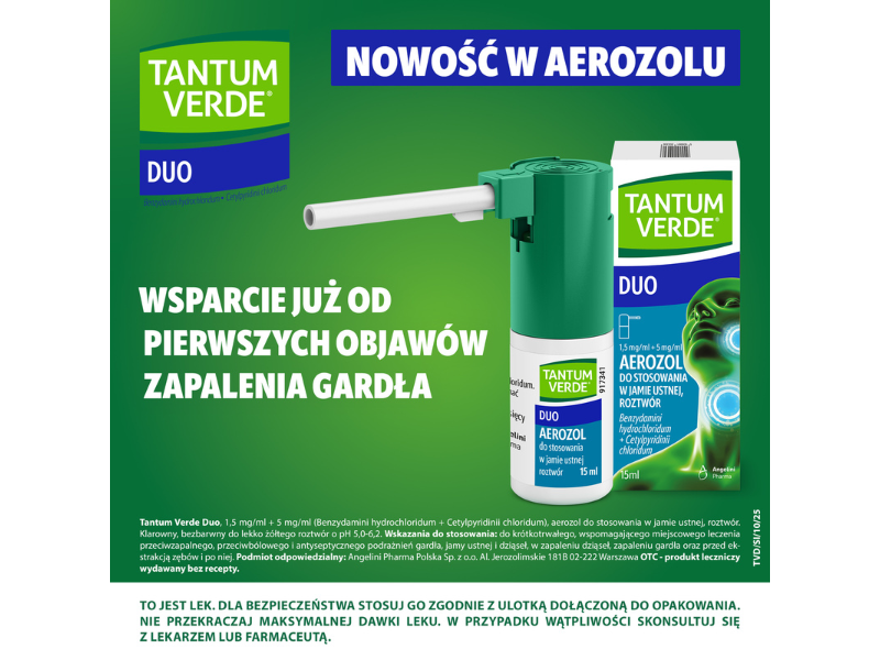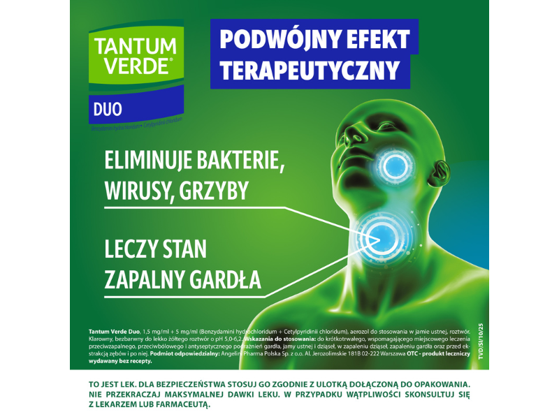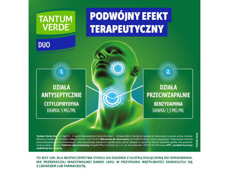 Tantum Verde Duo to aerozol do miejscowego stosowania w jamie ustnej i gardle, który łączy działanie dwóch substancji czynnych. Benzydamina działa przeciwzapalnie i przeciwbólowo, łagodząc dolegliwości gardła, natomiast chlorek cetylopirydyniowywykazuje właściwości antyseptyczne, zwalczając bakterie, wirusy i grzyby odpowiedzialne za infekcje. Preparat jest przeznaczony do krótkotrwałego wspomagającego leczenia u dorosłych, młodzieży oraz dzieci powyżej 6. roku życia.