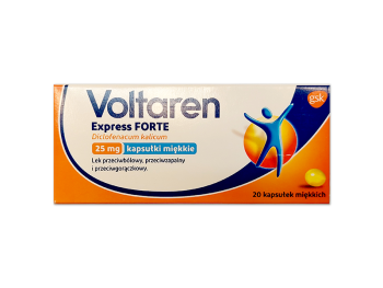 Voltaren Express Forte to lek przeciwbólowy i przeciwzapalny zawierający diklofenak potasowy, należący do grupy niesteroidowych leków przeciwzapalnych (NLPZ). Preparat dostępny jest w formie miękkich kapsułek, które szybko łagodzą ból i obniżają gorączkę. Stosuje się go w przypadku bólów mięśniowych, reumatycznych, bólów pleców, głowy, zębów, a także przy bolesnym miesiączkowaniu oraz objawach przeziębienia i grypy, takich jak gorączka i ból gardła. Diklofenak działa poprzez hamowanie syntezy prostaglandyn, co przyczynia się do zmniejszenia stanu zapalnego, bólu oraz obrzęku. Preparat jest przeznaczony dla dorosłych i młodzieży powyżej 14 roku życia.