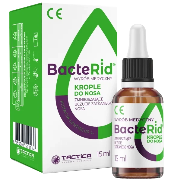 BacteRid to wyrób medyczny w postaci kropli do nosa, stosowany przy stanach zapalnych błony śluzowej nosa powodujących jej przekrwienie i uczucie zatkania. Można go również zastosować przy stanie zapalnym zatok przynosowych oraz nawracającym zapaleniu ucha środkowego. Wyrób medyczny zawiera olej z drzewa mastyksowego o właściwościach kojących oraz składniki emolientowe, które łagodzą podrażnienia i chronią śluzówkę. Preparat ułatwia upłynnienie wydzieliny i poprawia drożność nosa. Dawkowanie u dzieci od 2. roku życia to 3 krople 3 razy dziennie do każdego otworu nosowego, a u dorosłych – 5 kropli 2 razy dziennie.