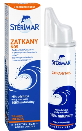 Sterimar Zatkany Nos to spray do nosa w postaci hipertonicznego roztworu wody morskiej z dodatkiem miedzi dla dorosłych i dzieci od 3. roku życia. Działa na zasadzie efektu osmotycznego – zmniejsza obrzęk błony śluzowej nosa i udrażnia przewody nosowe. Może być stosowany w przeziębieniu, nieżycie nosa i zapaleniu zatok, zapobiega rozwojowi grypy. Pomaga usuwać wydzielinę, kurz i alergeny oraz wspiera naturalne mechanizmy obronne śluzówki.