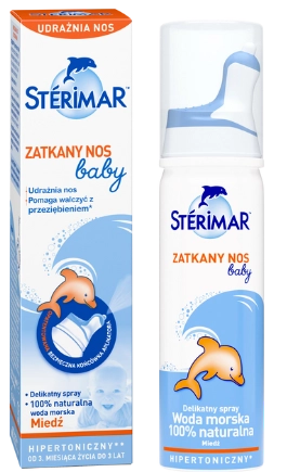 Sterimar Zatkany Nos Baby to spray donosowy dla niemowląt i dzieci od 3. miesiąca życia w postaci hipertonicznego roztworu wody morskiej bez konserwantów. Dzięki nowej, opatentowanej końcówce aplikatora, zapewnia jeszcze bardziej bezpieczną i delikatną aplikację aerozolu. Stosuje się go w celu udrożnienia nosa, zmniejszenia obrzęku i ułatwienia oddychania przy katarze. Sterimar wywiera korzystne działanie związane z uznanymi właściwościami soli mineralnych i morskich pierwiastków śladowych (dodatkowa zawartość miedzi).