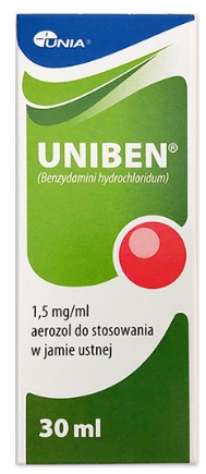 Uniben w formie aerozolu to preparat do stosowania w jamie ustnej i gardle, pomocny przy bólu i zaczerwienieniu spowodowanych infekcją. Benzydamina zmniejsza stan zapalny i łagodzi ból dodatkowo działa odkażająco i miejscowo znieczulająco, a glicerol dodatkowo nawilża śluzówkę. Aerozol może być stosowany zarówno u dorosłych, jak i u dzieci (powyżej 4 kg masy ciała), także po zabiegach w obrębie jamy ustnej. Spray ma słodki, miętowy smak. Spray stosuje się od 2 do 6 razy na dobę. Ilość aplikacji zależy od wieku pacjenta.