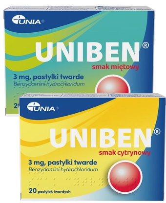 Uniben o smaku cytrynowym i miętowym to pastylki do ssania, które pomagają w łagodzeniu dolegliwości związanych ze stanem zapalnym jamy ustnej i gardła – takich jak ból, zaczerwienienie czy obrzęk. Substancja czynna benzydamina działa miejscowo przeciwzapalnie, przeciwbólowo, znieczulająco i odkażająco. Pastylki mogą być stosowane już przez dzieci powyżej 6. roku życia. Dawkowanie to 1 pastylka 3 razy na dobę, należy ją ssać powoli i nie rozgryzać.