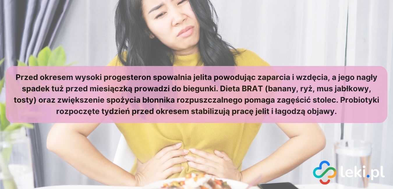 To efekt wahań hormonalnych: przed okresem wysoki poziom progesteronu spowalnia pracę jelit powodując zaparcia i wzdęcia. Gdy progesteron gwałtownie spada tuż przed miesiączką, a rosną prostaglandyny, jelita zaczynają pracować szybciej, co prowadzi do biegunki.