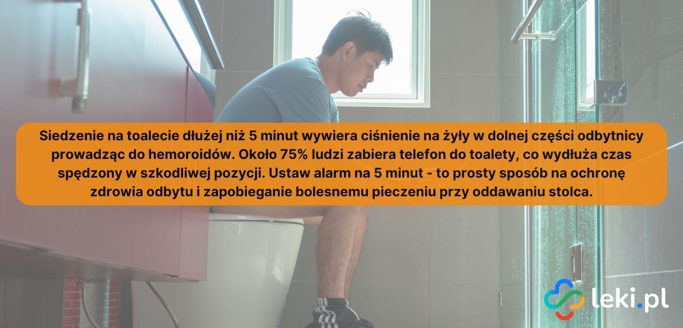 Długie siedzenie na toalecie wywiera ciśnienie na żyły w dolnej części odbytnicy, co może prowadzić do powstawania hemoroidów. Około 75% ludzi zabiera telefon do toalety, co wydłuża czas spędzony w tej pozycji. Jeśli nie chcesz zrezygnować z tego nawyku, ustaw alarm na 5 minut – to prosty sposób na ochronę zdrowia odbytu.