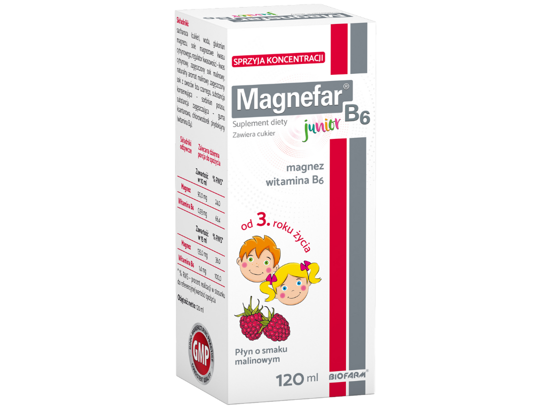 | Magnefar B6 Junior | Syrop | Cytrynian magnezu Glukonian magnezu Witamina B6 | 90 mg jonów magnezu | Dobrze przyswajalna organiczna forma magnezu | Powyżej 3 lat -> 10 ml raz dziennie, przed lub w trakcie posiłku | 120 ml | • suplement diety • od 3. roku życia • bez laktozy • zawiera cukier i konserwanty • smak malinowy |