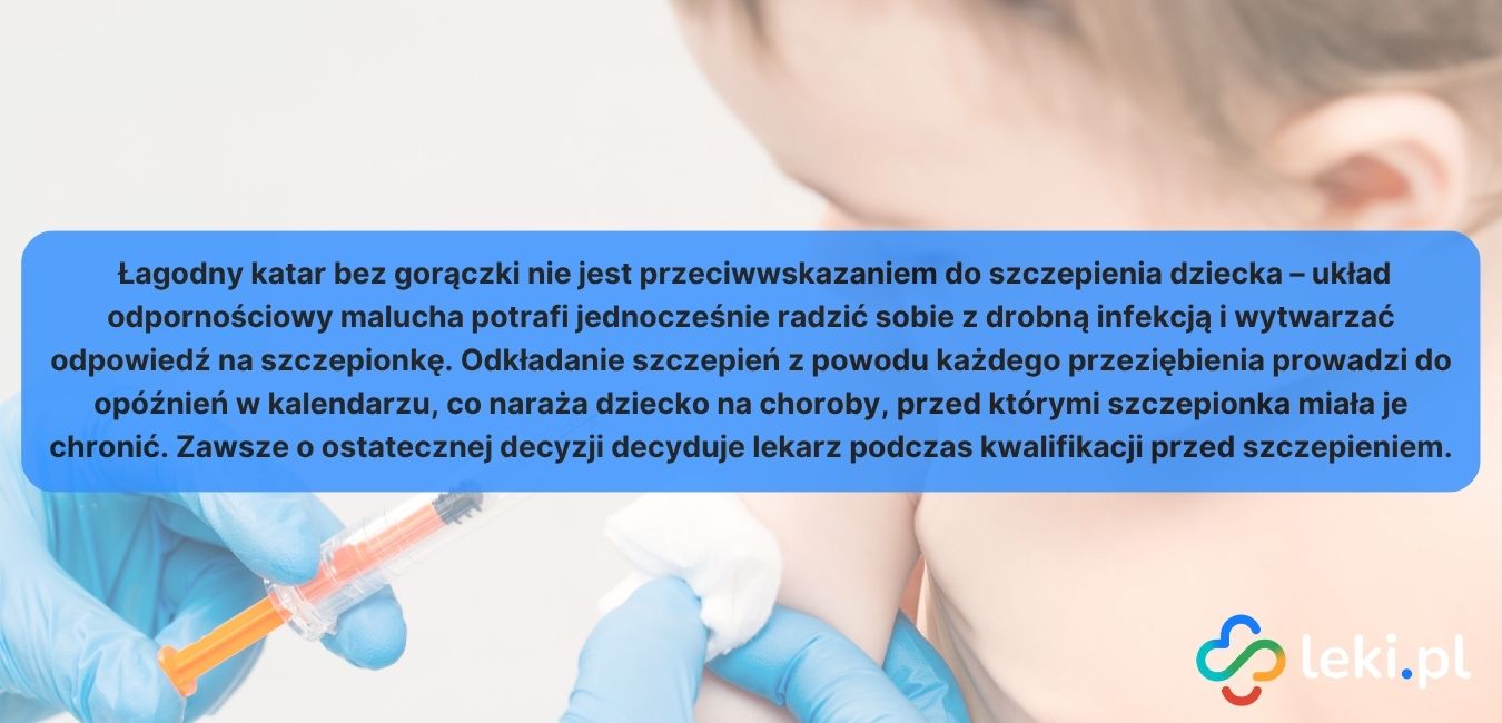 Łagodny katar nie jest przeciwwskazaniem do szczepienia dziecka. Dziecko z niewielkim przeziębieniem, bez wysokiej gorączki, może zostać zaszczepione zgodnie z planem. Jeśli jednak dziecko jest osłabione, ma wysoką gorączkę lub przechodzi ostrą infekcję, szczepienie należy odłożyć do czasu pełnego wyzdrowienia. Katar po szczepieniu to naturalna reakcja organizmu, zwykle ustępująca w ciągu kilku dni i niepowodująca powikłań.