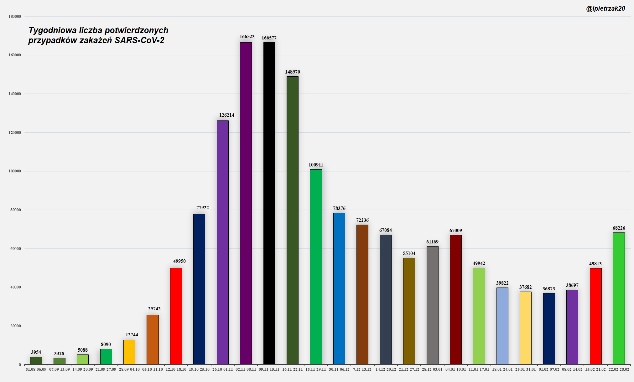 Niezależnie od tego, że omawiane liczby zgonów oraz zakażeń mogą być niedoszacowane, na dane którymi dysponujemy, najrozsądniej jest patrzeć w sposób zbiorczy, porównując tydzień do tygodnia. Poniżej wykresy prezentujące zmiany liczb tygodniowych od 31 sierpnia 2020r.