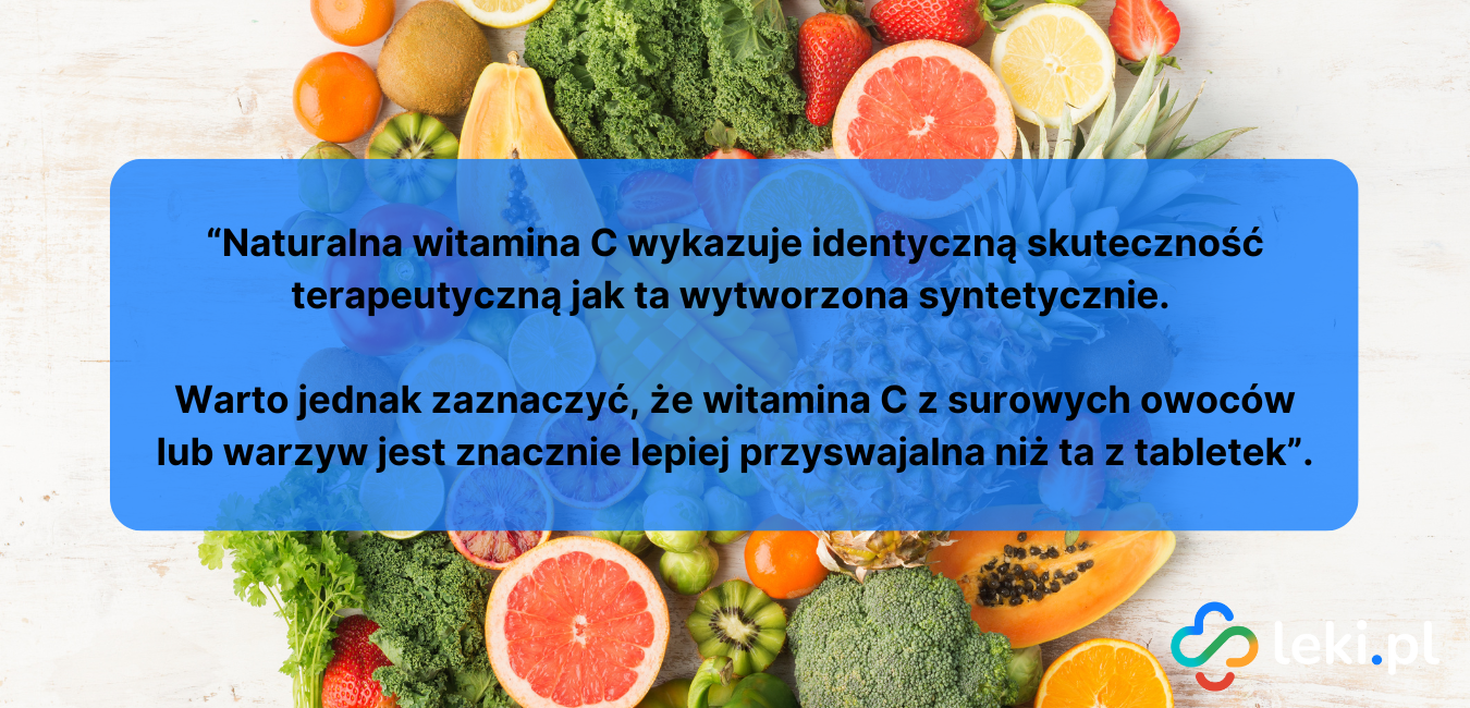 Każdy lek z dopiskiem „naturalny” zyskuje w naszych oczach. Niemniej, warto sobie uzmysłowić, że pod względem chemicznym witamina C zsyntetyzowana w laboratorium jest taka sama, jak wit. C z np. owoców dzikiej róży. Gdy przyjmujemy tabletkę z kwasem askorbinowym, nasz organizm nie potrafi rozróżnić, skąd on pochodzi. Całe szczęście! To po prostu nie ma znaczenia. Naturalna witamina C wykazuje identyczną skuteczność terapeutyczną jak ta wytworzona syntetycznie. Warto jednak zaznaczyć, że witamina C z surowych owoców lub warzyw jest znacznie lepiej przyswajalna niż ta z tabletek [7,8].