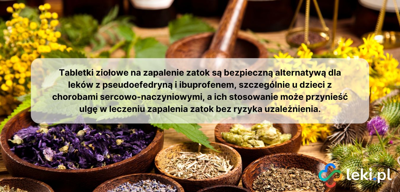 Kolejną grupą tabletek na zatoki dla dzieci są tabletki ziołowe na zatoki. Są one bezpieczne do stosowania nawet u osób, które cierpią na choroby sercowo-naczyniowe lub są uczulone na pseudoefedrynę albo ibuprofen. Do klasycznych tabletek ziołowych na zatoki zaliczany Soledum forte, Sinupret, Sinupret extract, RenoPuren Zatoki MAX, Sinulan forte, Sinulan Duo forte, Zatoxin, Sinuspax, Cosinus, Zatogrip forte 12+. Najczęstsze wyciągi ziołowe, które w nich znajdziemy, pochodzą z takich roślin, jak eukaliptus, werbena, dziewanna, goryczka żółta, tymianek, pierwiosnek i bez czarny. Każda z roślin różni się nieco swoim działaniem, ale ich głównym celem jest upłynnienie zalegającej wydzieliny oraz lekkie działanie wykrztuśne, co pomaga pozbyć się złogów, odetkać nos i zredukować obrzęk, ból oraz nadmierny wyciek [6].