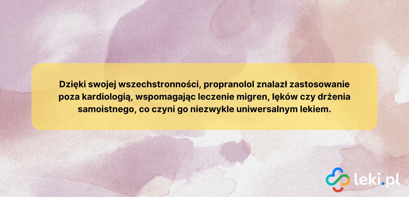 Propranolol to wyjątkowo wszechstronny lek, znajdujący zastosowanie w leczeniu wielu schorzeń, takich jak nadciśnienie tętnicze, migreny, zaburzenia rytmu serca, lęk sytuacyjny czy drżenie samoistne. Jego skuteczność wynika z nieselektywnego działania na receptory beta, w wyniku czego wpływa nie tylko na układ krążenia i serca, ale także ośrodkowy układ nerwowy. Aby uniknąć działań niepożądanych, takich jak zmęczenie czy zawroty głowy, stosuj propranolol zgodnie z zaleceniami lekarza i poinformuj go o wszelkich chorobach współistniejących, szczególnie astmie, bradykardii czy niedociśnieniu. Pamiętaj, że propranolol nie jest lekiem odpowiednim dla każdego, ale jego wszechstronność i skuteczność sprawiają, że może znacząco poprawić jakość życia w wielu różnych sytuacjach zdrowotnych.