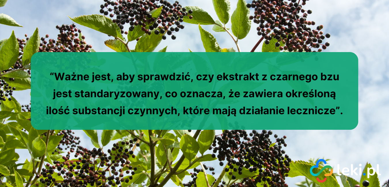 Przy wyborze preparatu z czarnym bzem warto dokładnie sprawdzić jego skład. Czasami w produktach znajduje się sok, a innym razem ekstrakt z soku. Ważne jest, aby sprawdzić, czy ekstrakt z czarnego bzu jest standaryzowany, co oznacza, że zawiera określoną ilość substancji czynnych, które mają działanie lecznicze. Najczęściej w czarnym bzie standaryzuje się antocyjany lub polifenole. Jeśli preparat nie jest standaryzowany, trudno określić, ile składników aktywnych znajduje się w produkcie i jak skutecznie może działać.