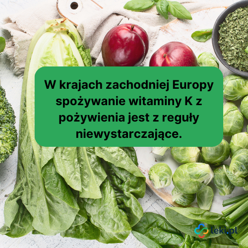 W krajach zachodniej Europy spożywanie witaminy K z pożywienia jest z reguły niewystarczające. Przede wszystkim jest to widoczne u wegan i osób stosujących modne w tych społeczeństwach diety wykluczeniowe. Dodatkowo deficyt witaminy K zwiększają schorzenia woreczka żółciowego, antybiotykoterapia czy przewlekła biegunka. W Unii Europejskiej zaleca się spożywanie 1 µg witaminy K na kilogram masy ciała dziennie. Dla uproszczenia wskazuje się jej dzienne spożycie na 60 µg. Badania pokazują jednak, że może to być ilość niewystarczająca, dlatego w Stanach Zjednoczonych rekomendowane dzienne dawki witaminy K to 120 µg dla mężczyzn i 90 µg dla kobiet [1].