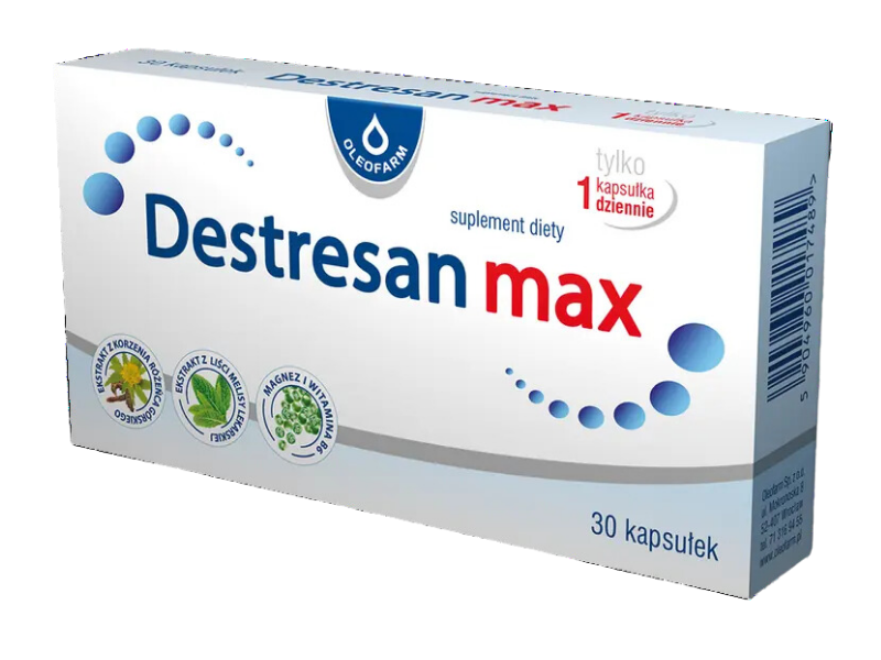 | Destresan max | • ekstrakt z liści melisy • ekstrakt z korzenia różeńca górskiego • magnez • witamina B6 | Kapsułki żelatynowe | Ułatwia relaks i wyciszenie, wspomaga prawidłowe funkcjonowanie układu nerwowego. | Produkt przeznaczony jest dla osób dorosłych. |