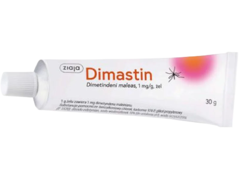 Głównym składnikiem aktywnym leku Dimastin jest dimetyndenu maleinian. W 1 gramie żelu znajduje się 1 mg tej substancji[1]. Dimetyndenu maleinian jest antagonistą receptorów histaminowych H1, co oznacza, że blokuje działanie histaminy, związku odpowiedzialnego za reakcje alergiczne.