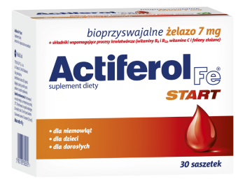 Actiferol Fe Start to suplement diety zawierający unikalną formę żelaza poddaną mikronizacji i emulgacji. Dzięki mikronizacji, czyli dużemu rozdrobnieniu, przyswajalność żelaza z pirofosforanu żelaza(III) jest wyższa. Żelazo zawarte w Actiferol Fe uwalnia się w jelitach, a nie w żołądku, dzięki czemu nie odczuwa się dolegliwości ze strony układu pokarmowego. Preparat przeznaczony jest dla niemowląt, dzieci i dorosłych.