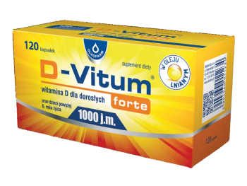D-Vitum forte to suplement diety zawierający witaminę D3 (cholekalcyferol) oraz wysokolinolenowy olej z nasion lnu, bogaty w kwasy omega-3, w tym kwas alfa-linolenowy (ALA). Preparat przeznaczony jest do uzupełniania diety osób dorosłych i dzieci powyżej 6. roku życia w witaminę D, która wspiera zdrowie kości, zębów, mięśni oraz układu odpornościowego i krążenia. Olej lniany dostarcza kwas alfa-linolenowy, który pomaga utrzymać prawidłowy poziom cholesterolu, wspiera pracę serca, funkcje poznawcze oraz jakość widzenia. Suplementacja witaminą D jest szczególnie ważna w okresach ograniczonej ekspozycji na słońce oraz u osób z ograniczoną syntezą skórną tej witaminy.