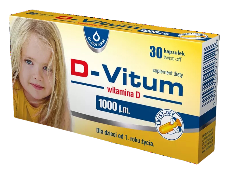 D-Vitum to suplement diety w formie kapsułek twist-off przeznaczony dla dzieci po 1. roku życia, zawierający witaminę D3 (cholekalcyferol). Preparat wspiera prawidłowy wzrost i rozwój kości, utrzymanie zdrowych zębów oraz funkcjonowanie mięśni. Witamina D pomaga w prawidłowym wchłanianiu i wykorzystaniu wapnia oraz fosforu, a także wspiera układ odpornościowy dziecka. Suplement zawiera olej słonecznikowy lub rzepakowy, olej MCT oraz witaminę D3. Produkt stosowany jest w celu uzupełnienia diety w witaminę D, szczególnie w okresach ograniczonej ekspozycji na światło słoneczne.