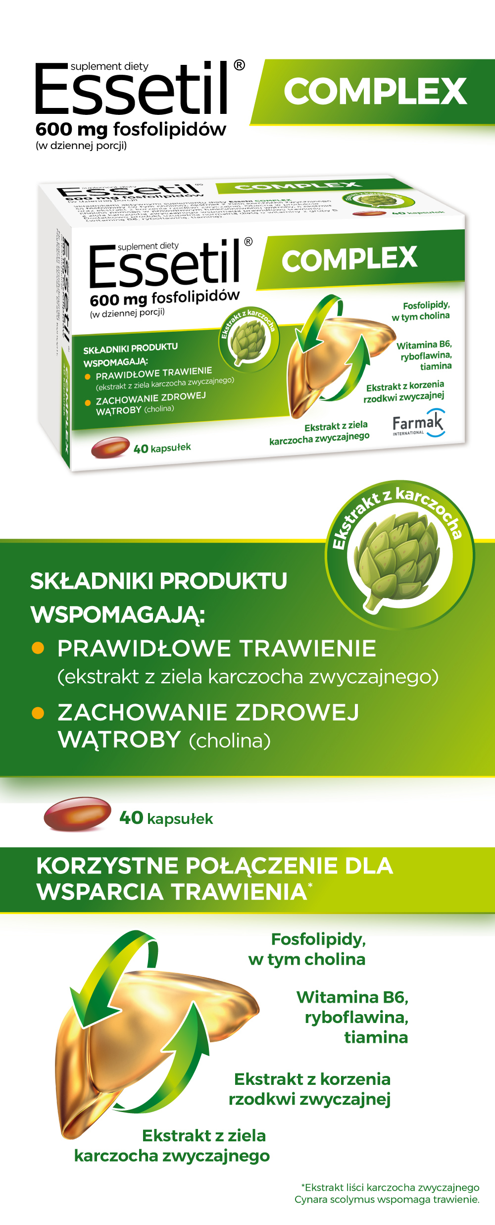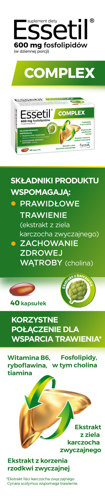 Essetil Complex to kompleksowy suplement wspierający prawidłowe funkcjonowanie wątroby. Zawiera sprawdzoną kombinację fosfolipidów z lecytyny sojowej, ekstraktów roślinnych z karczocha i rzodkwi oraz witamin z grupy B. Wszystkie składniki są bezpieczne i przebadane. Produkt jest przeznaczony do długotrwałego stosowania i może stanowić wsparcie dla osób dbających o zdrowie swojej wątroby. Pamiętaj jednak, że najważniejsza jest zdrowa i zrównoważona dieta oraz zdrowy tryb życia.