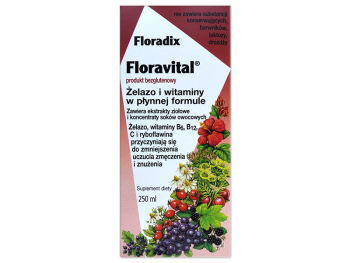 Floradix Floravital to płynny suplement diety, który łączy naturalne składniki, takie jak zioła i soki owocowe, wzbogacony w organiczne żelazo oraz witaminy z grupy B. Przeznaczony dla osób z niedoborami żelaza, zwłaszcza kobiet w ciąży, karmiących oraz dzieci od 3. roku życia. Preparat wspiera procesy krwiotwórcze, pomaga w redukcji zmęczenia oraz poprawia kondycję organizmu. Dzięki przyjemnemu smakowi i płynnej formie jest łatwy w przyjmowaniu, co czyni go idealnym wsparciem w codziennej diecie.