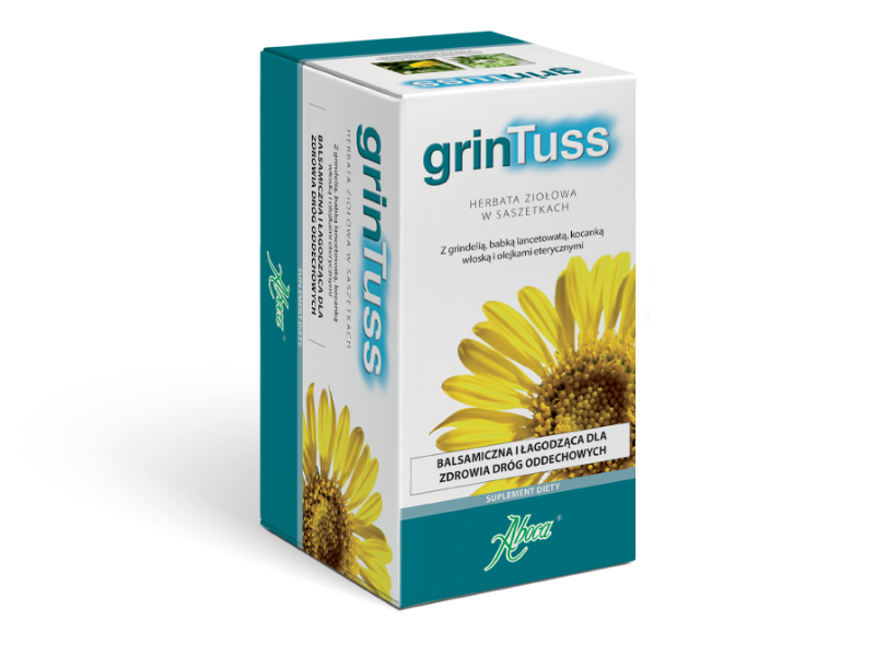 GrinTuss Herbata to suplement diety korzystnie wpływający na zdrowie dróg oddechowych. Dzięki zawartym w składzie ziołom, takim jak grindelia, babka lancetowata i kocanka włoska (odmiana HyperCreso wybrana ze względu na wysoką zawartość substancji aktywnych), oferuje skuteczne działanie balsamiczne i powlekające. Działanie herbaty ziołowej GrinTuss jest uzupełniane olejkami eterycznymi z mięty i eukaliptusa, które dzięki zaparzeniu w gorącej wodzie, wyzwalają ciepłe opary balsamiczne, przynoszące ulgę w przypadku podrażnionego gardła i kaszlu.