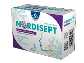 Nordisept porost islandzki z witaminą C to suplement diety zawierający wyciąg z porostu islandzkiego (Cetraria islandica L.) oraz witaminę C. Porost islandzki dzięki zawartości związków śluzowych i polisacharydów tworzy ochronną warstwę na błonach śluzowych gardła, krtani i strun głosowych, co pomaga łagodzić ich podrażnienia i ból. Witamina C wspiera prawidłowe funkcjonowanie układu odpornościowego oraz chroni komórki przed stresem oksydacyjnym. Preparat jest przeznaczony dla dzieci powyżej 6 roku życia, młodzieży i dorosłych, jako wsparcie w utrzymaniu zdrowia gardła oraz odporności organizmu.