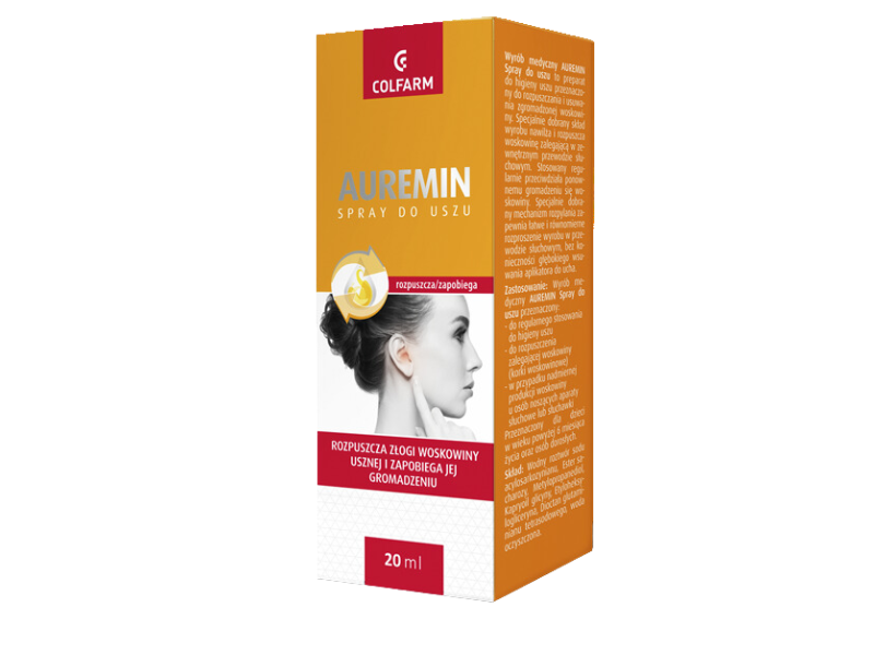 Auremin Spray do uszu to wyrób medyczny przeznaczony do higieny uszu. Preparat skutecznie rozpuszcza i usuwa zgromadzoną woskowinę uszną, a dzięki specjalnie dobranemu składowi dodatkowo nawilża przewód słuchowy. Jest szczególnie wskazany przy korkach woskowinowych, które mogą powodować dyskomfort i problemy ze słuchem.