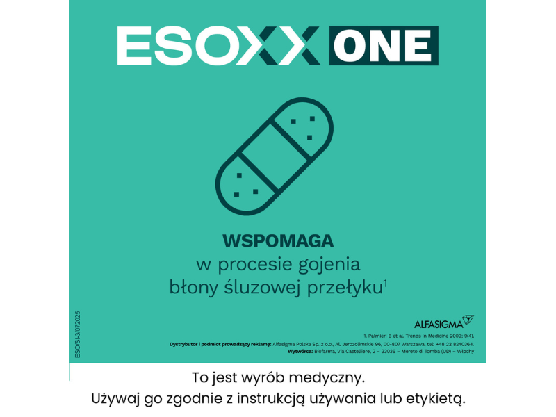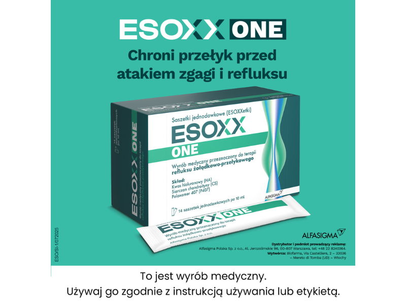Esoxx One to wyrób medyczny w formie syropu o działaniu miejscowo osłaniającym, stosowany w łagodzeniu objawów refluksu żołądkowo-przełykowego, takich jak zgaga, ból w nadbrzuszu, zarzucanie treści żołądkowej, kaszel podrażnieniowy czy chrypka. Preparat tworzy bioadhezyjną barierę ochronną na błonie śluzowej przełyku, chroniąc ją przed drażniącym działaniem kwasu żołądkowego. Zawiera kwas hialuronowy i siarczan chondroityny, które wspierają ochronę i gojenie śluzówki, oraz poloxamer 407, który zwiększa przyczepność preparatu do ścian przełyku. Esoxx One jest szczególnie pomocny przy refluksie nasilającym się w nocy oraz gdy inne metody leczenia nie przynoszą pełnej ulgi.