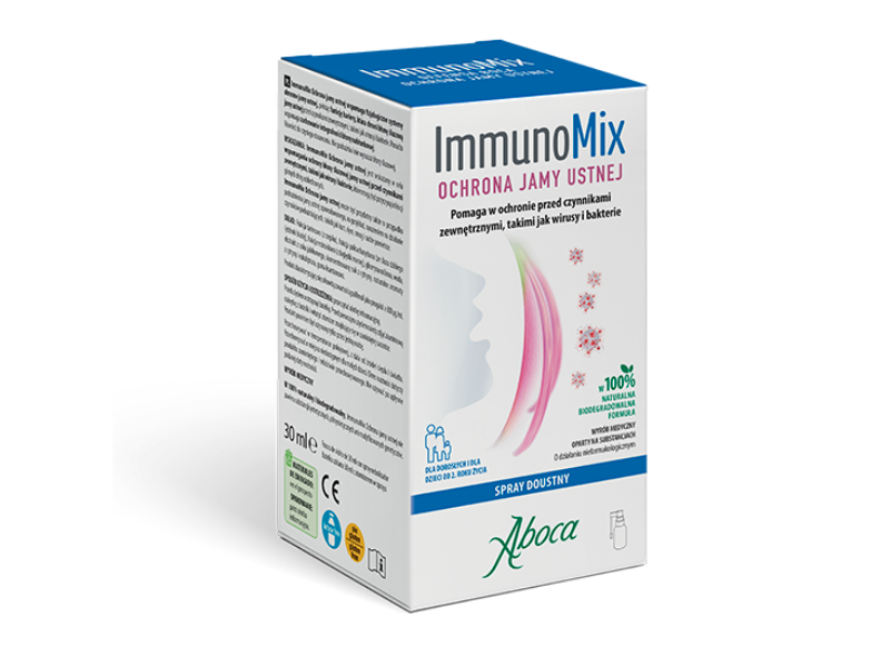 Immunomix Ochrona Jamy Ustnej to wyrób medyczny w formie sprayu doustnego, który wspomaga systemy obronne jamy ustnej. Pełni on funkcję bariery ochronnej dla błony śluzowej jamy ustnej przed potencjalnie szkodliwymi czynnikami zewnętrznymi, takimi jak wirusy i bakterie. Dodatkowo produkt wspomaga zachowanie integralności błony nabłonkowej, działając zmiękczająco, nawilżająco i łagodząco.