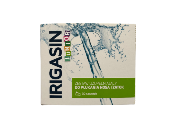 IRIGASIN JUNIOR to wyrób medyczny przeznaczony do przygotowania roztworu do płukania nosa i zatok przynosowych. Produkt zawiera chlorek sodu, który skutecznie oczyszcza jamę nosową z zalegającego śluzu, bakterii, alergenów i wirusów. Zestaw uzupełniający składa się z 30 saszetek z proszkiem, które umożliwiają przygotowanie zarówno roztworu izotonicznego, jak i hipertonicznego, w zależności od potrzeb pacjenta. Wyrób przeznaczony jest dla dzieci od 4. roku życia.