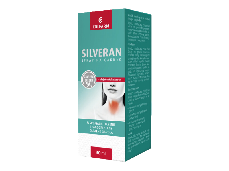 Silveran spray do gardła to wyrób medyczny wspomagający leczenie stanów zapalnych gardła i jamy ustnej, wywołanych infekcjami bakteryjnymi i wirusowymi. Preparat tworzy ochronny film na błonie śluzowej, łagodząc ból, pieczenie oraz drapanie. Zawiera nanocząsteczki srebra aXonnite, które hamują rozwój drobnoustrojów, ekstrakt z porostu islandzkiego tworzący ochronną powłokę oraz odświeżający i odkażający olejek eukaliptusowy. Silveran jest stosowany wspomagająco w leczeniu zapalenia gardła, jamy ustnej oraz stanów zapalnych dziąseł i po zabiegach dentystycznych.
