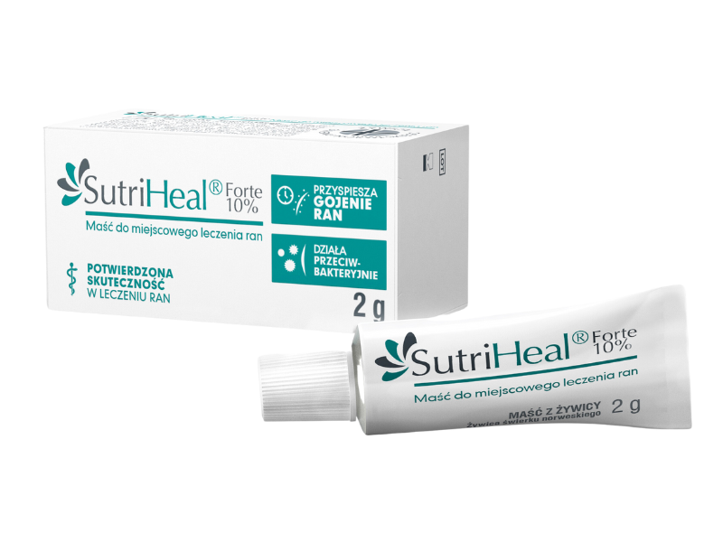 SutriHeal Forte to wyrób medyczny w formie maści przeznaczony do wspomagania gojenia ran różnego rodzaju. Produkt zawiera rafinowaną żywicę świerku norweskiego w stężeniu 5%, która została oczyszczona w opatentowanym procesie rafinacji. Maść opracowano w Finlandii, a jej skuteczność potwierdzono w licznych badaniach obserwacyjnych prowadzonych między innymi w Finlandii i Wielkiej Brytanii. Produkt jest zalecany przez ekspertów w leczeniu ran zakażonych i stanowi bezpieczną alternatywę dla preparatów zawierających antybiotyki.