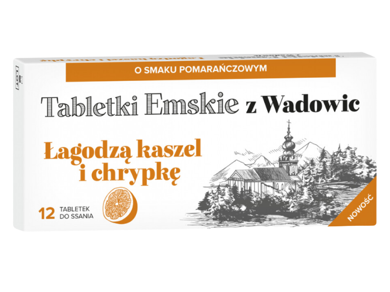 Emskie z Wadowic to tabletki do ssania o smaku pomarańczowym, które łagodzą kaszel, chrypkę oraz uczucie suchości w jamie ustnej i gardle. Zawierają substytut soli emskiej z kationami i anionami, które wspomagają nawilżenie błon śluzowych, ułatwiają odkrztuszanie i rozrzedzają wydzielinę. Produkt jest szczególnie polecany osobom pracującym głosem oraz przebywającym w suchych lub zapylonych pomieszczeniach. Działa miejscowo, podnosząc pH w jamie ustnej i wspierając naturalne procesy ochronne błon śluzowych.